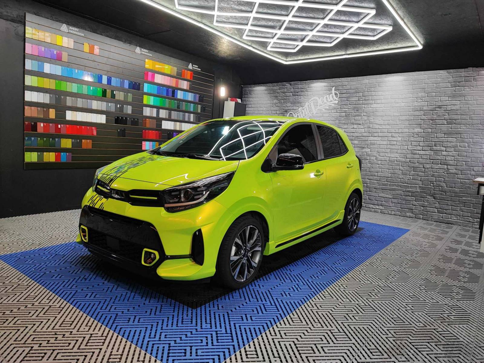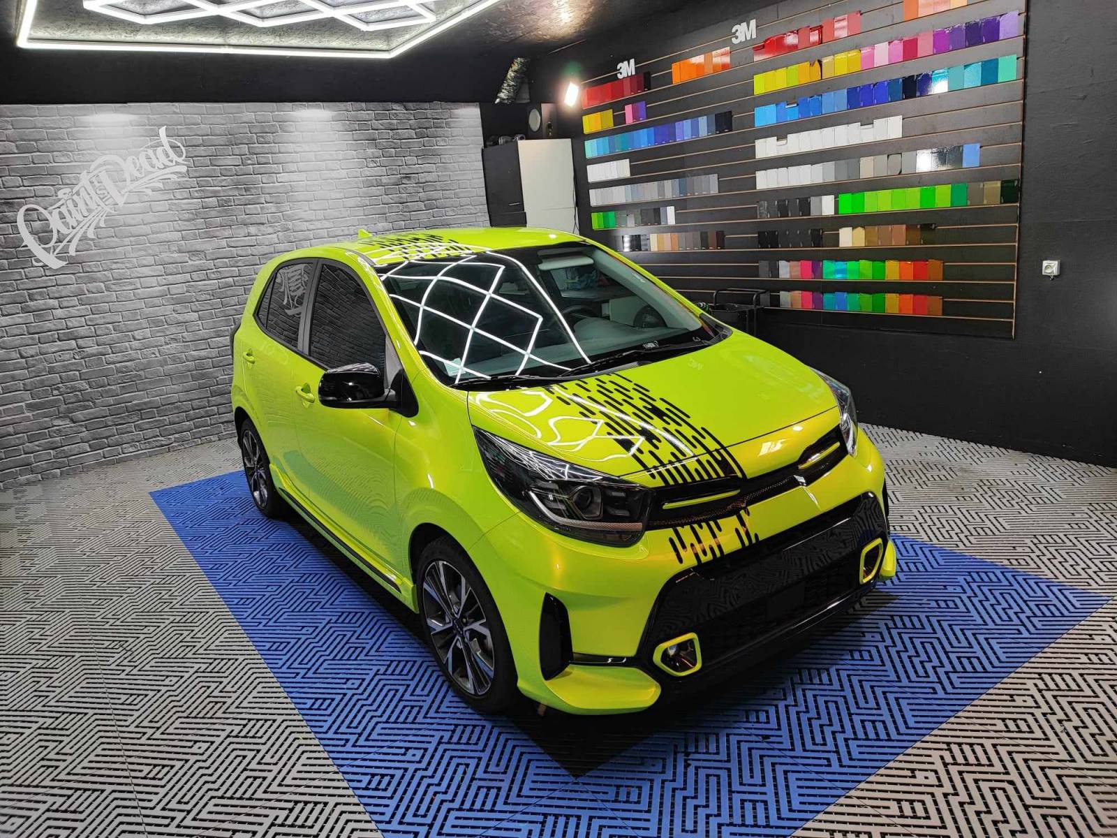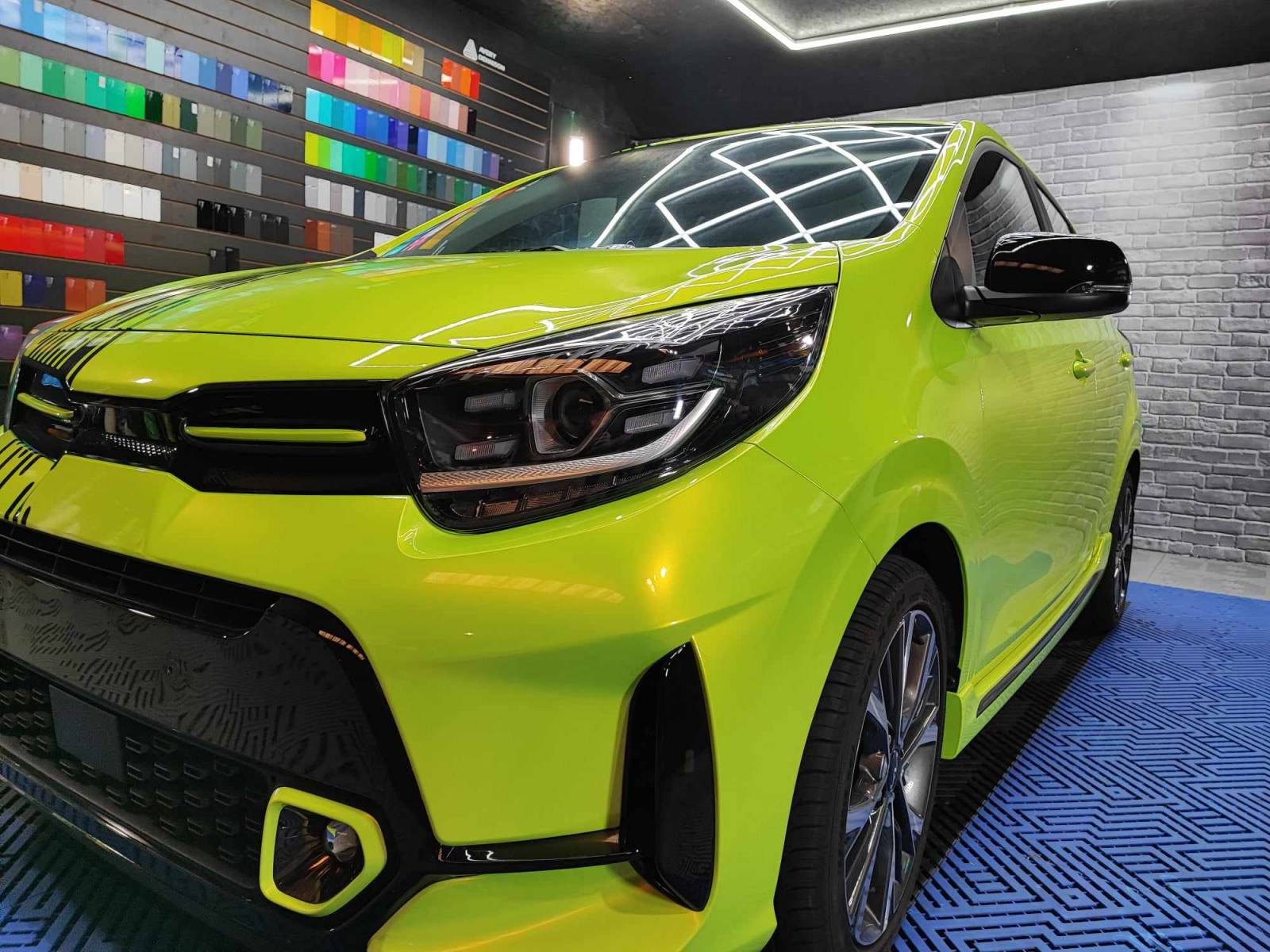 sur cette Kia Picanto nous avons fait un covering jaune qui vire au vert à la lumière ainsi nous avons rajouté du noir afin de casser la grosse masse de couleur.